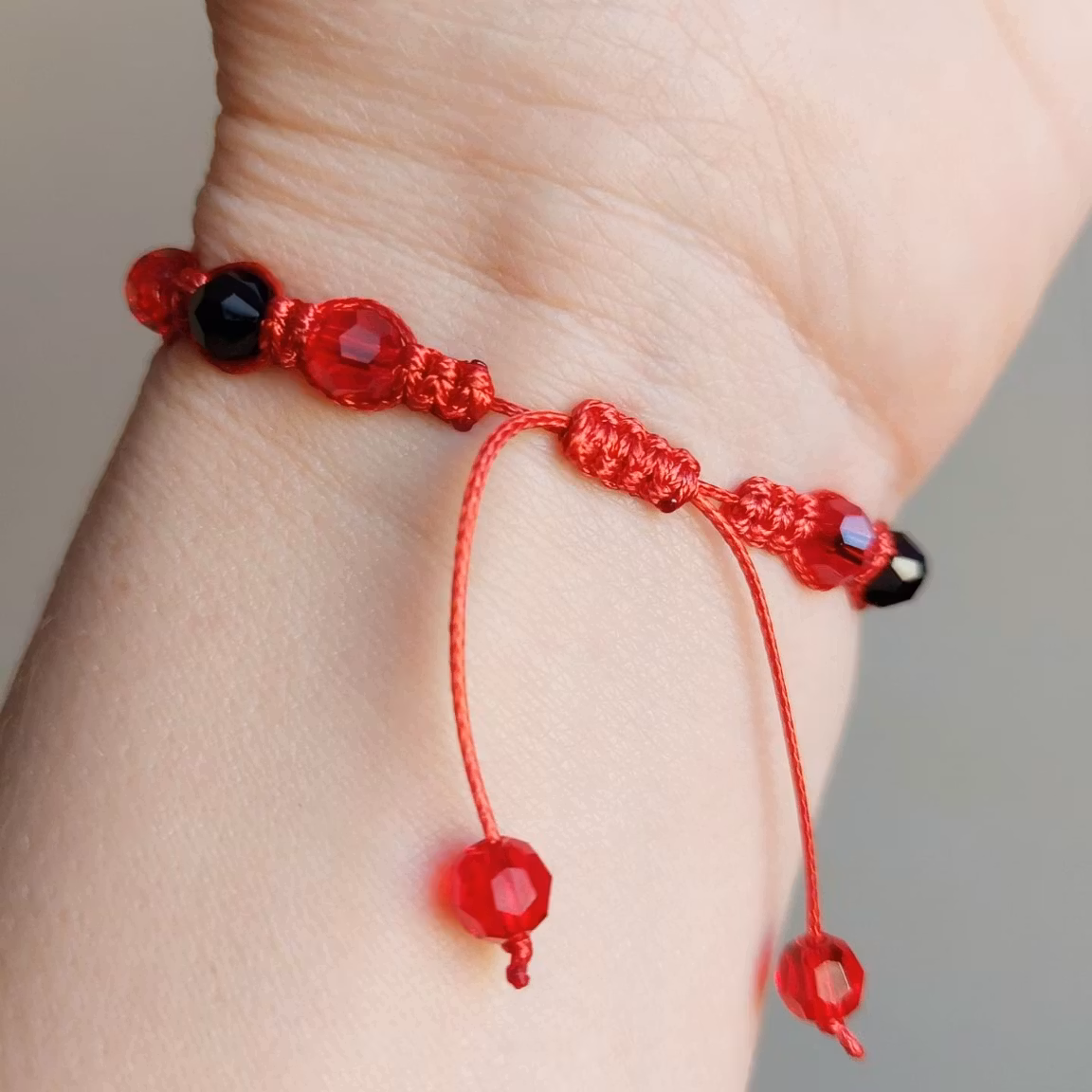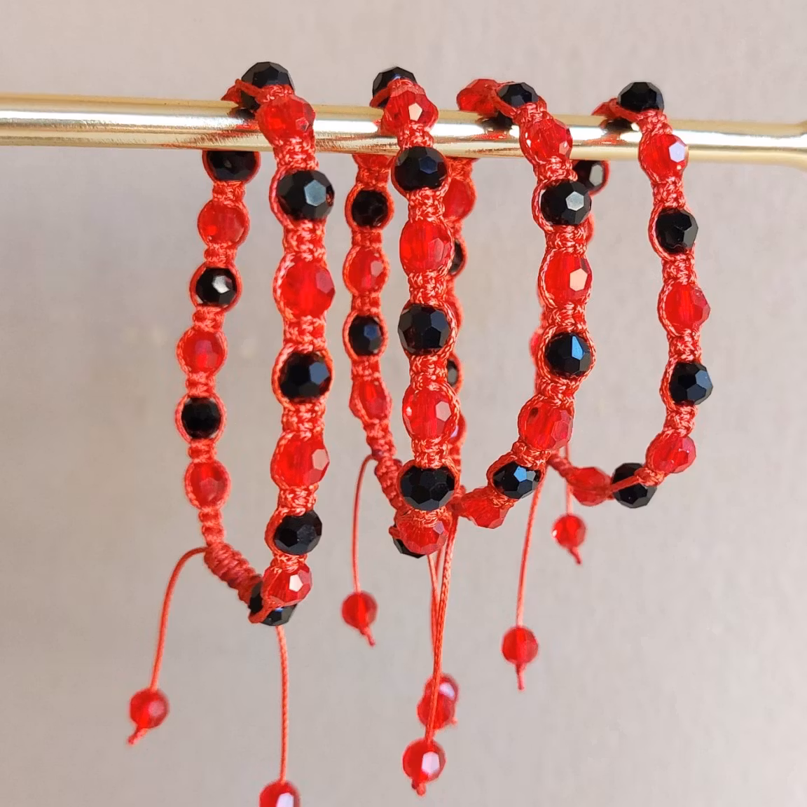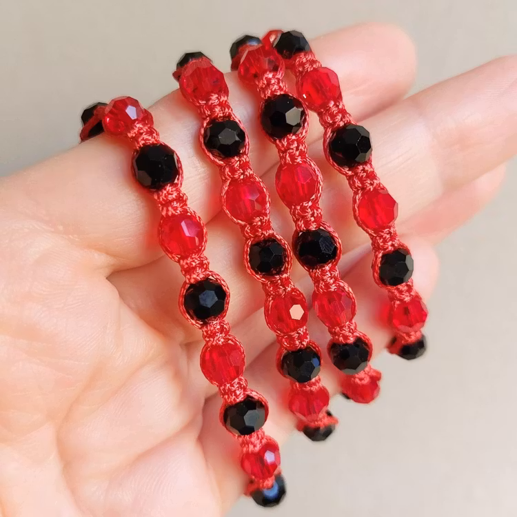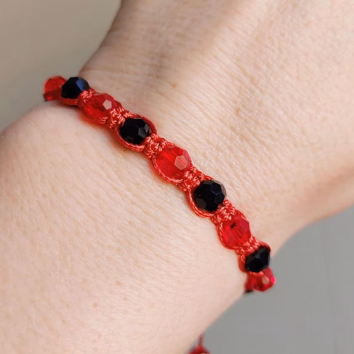 Makraméarmband av vaxad bomullstråd med facetterade glaspärlor.