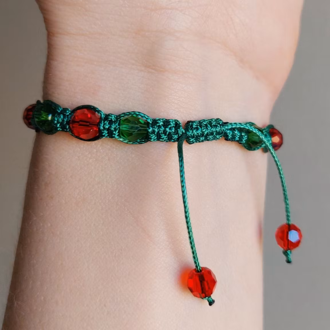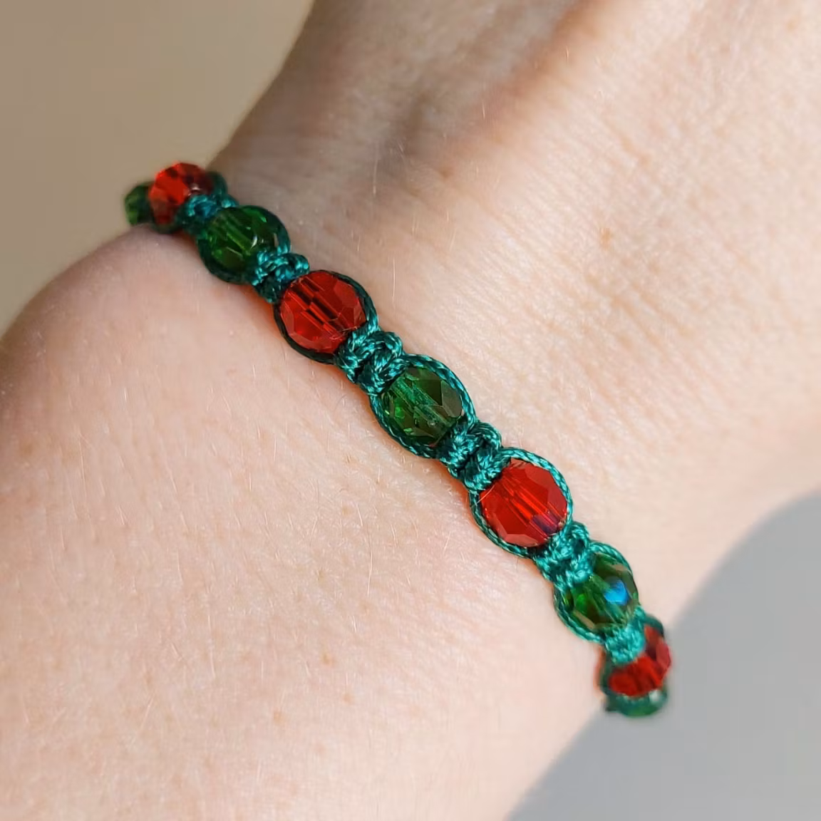 Makraméarmband av vaxad bomullstråd med röda och gröna facetterade pärlor av glas.