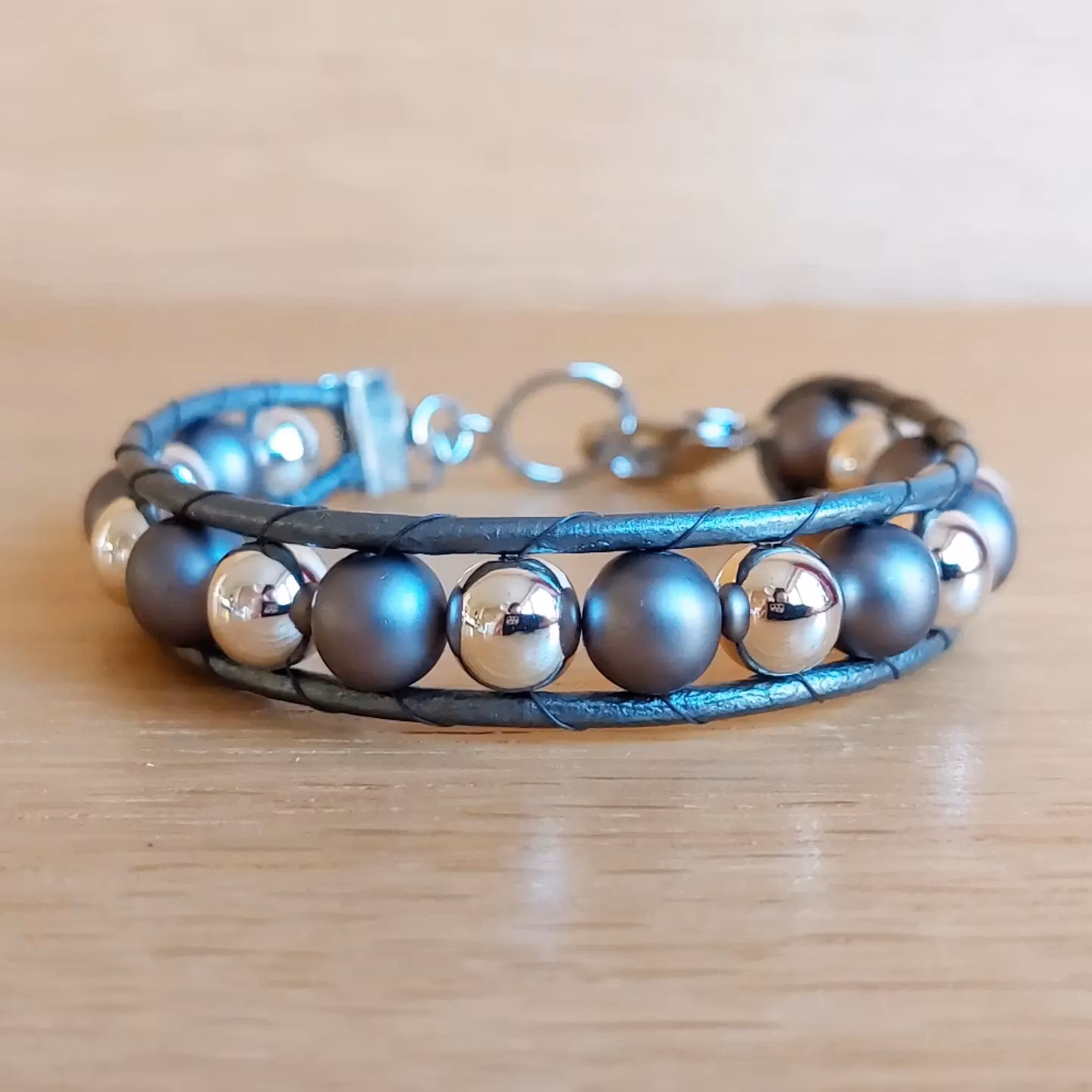 Armband med äkta läder och glaspärlor i silver- och matt metallic-grått.