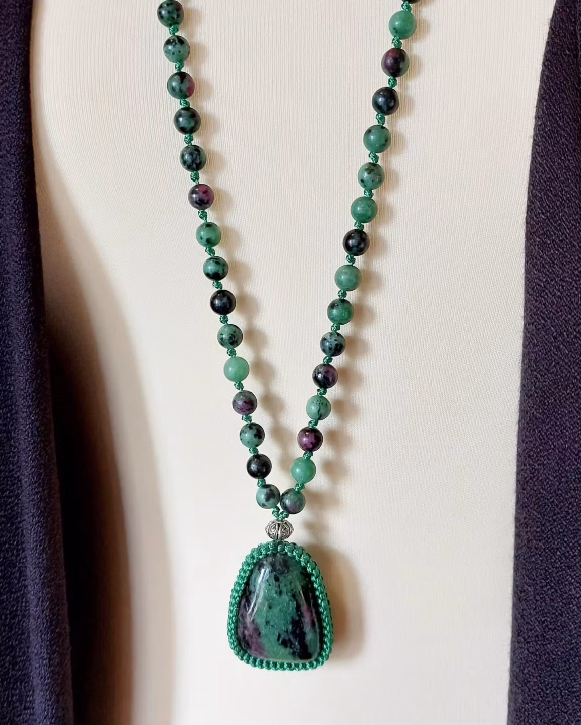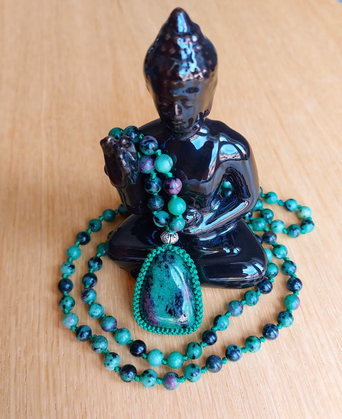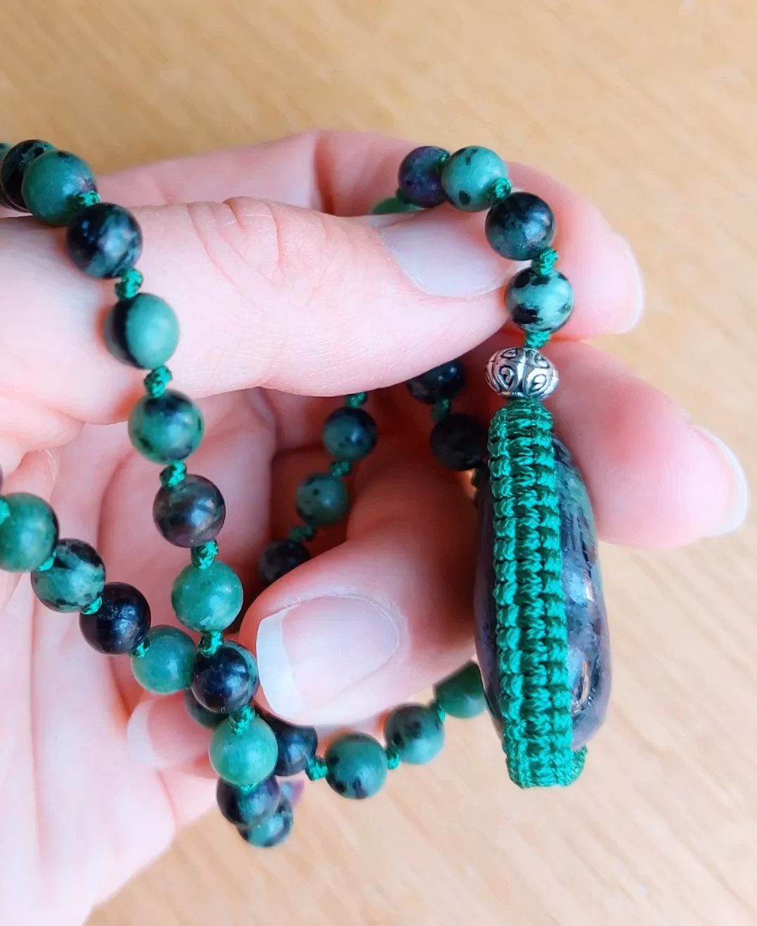 Hem › Produkter › Malahalsband › Mala | Zoisite med rubin Mala | Zoisite med rubin Produkten är tyvärr slut i lager. :( Mala med 108 pärlor av zoisite med rubin, 6 mm.Unikt hänge infattat av vaxad bomullstråd med makramé-teknik.